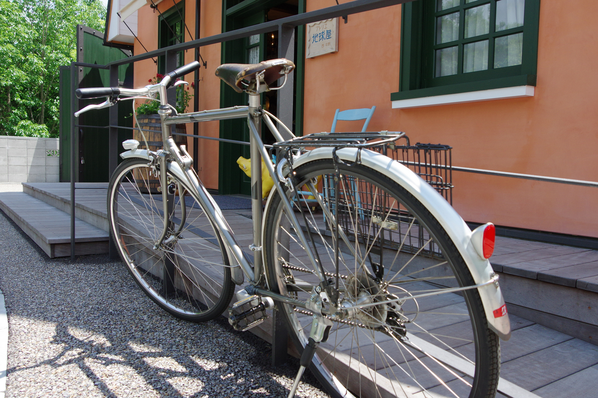 地球屋の前にとめてある自転車。そうこれはCIAもびっくりのリサーチと戦略で主人公の雫を射止めた聖司君のもの。(※注 管理人は耳をすませばの大ファンです)